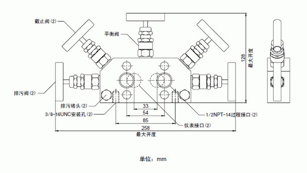 出口(2×):共面法蘭(與3051變送器連接)中心距33mm